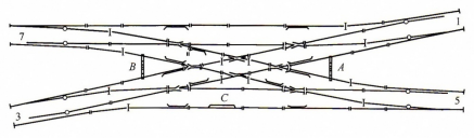 ⑵纵向水平调查,比较确定起道基点。选择大长平比较好的外直股,在起道初基点相对的外直股,纵向测量轨面水平差C,比较确定交叉渡线起道基点,从而使交叉渡线保持同A平面的起道量。