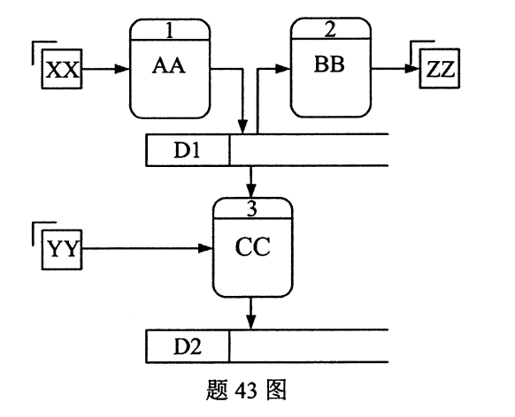 某系统顶层数据流程图如题43图所示,若数据流程图所表示的处理功能是相对独立的,则可以把它们看成是一类特定的事务,请将该数据流程图转换为控制结构图,忽略模块间的信息传递。